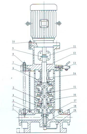 1,該泵為立式、多級(jí)節(jié)段式結(jié)構(gòu).泵進(jìn)出水法蘭處在同一直線上,葉輪采用水力平衡方式,軸向力, 泵下端有一導(dǎo)軸承.軸通過夾殼聯(lián)軸器與電機(jī)軸固定傳動(dòng).外筒為不銹鋼筒。
