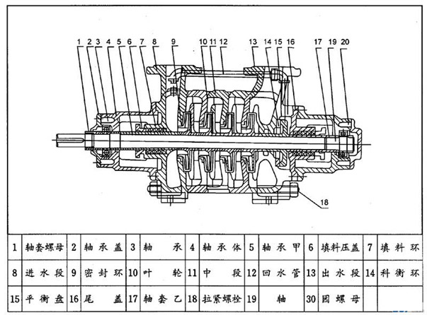 G型水泵為多級分段式,其吸入口位于進水段上,吐出口在出水段上均垂直向上,其揚程機根據(jù)使用而增減水泵級數(shù)。水泵裝配良好瑟否,對性能影響關(guān)系很大,萬其是各個葉輪的出口與導(dǎo)葉進口之寧肯對位置,每級葉輪的吐出口中心必須對準導(dǎo)葉的中心,其中稍有偏差即將使水段上均直向上,其揚程可根據(jù)使用而增減水泵級數(shù)。水泵裝配良好與否,對性能影響關(guān)系很大,尤其是各個葉輪的出口與導(dǎo)葉進口之相對位置,每級葉輪的吐出口中心必須對準導(dǎo)葉的中心,其中稍有偏差即將使水泵的流量減少,揚程降低,效率差,故在檢修裝配時務(wù)必注意,若有偏差必須調(diào)整。