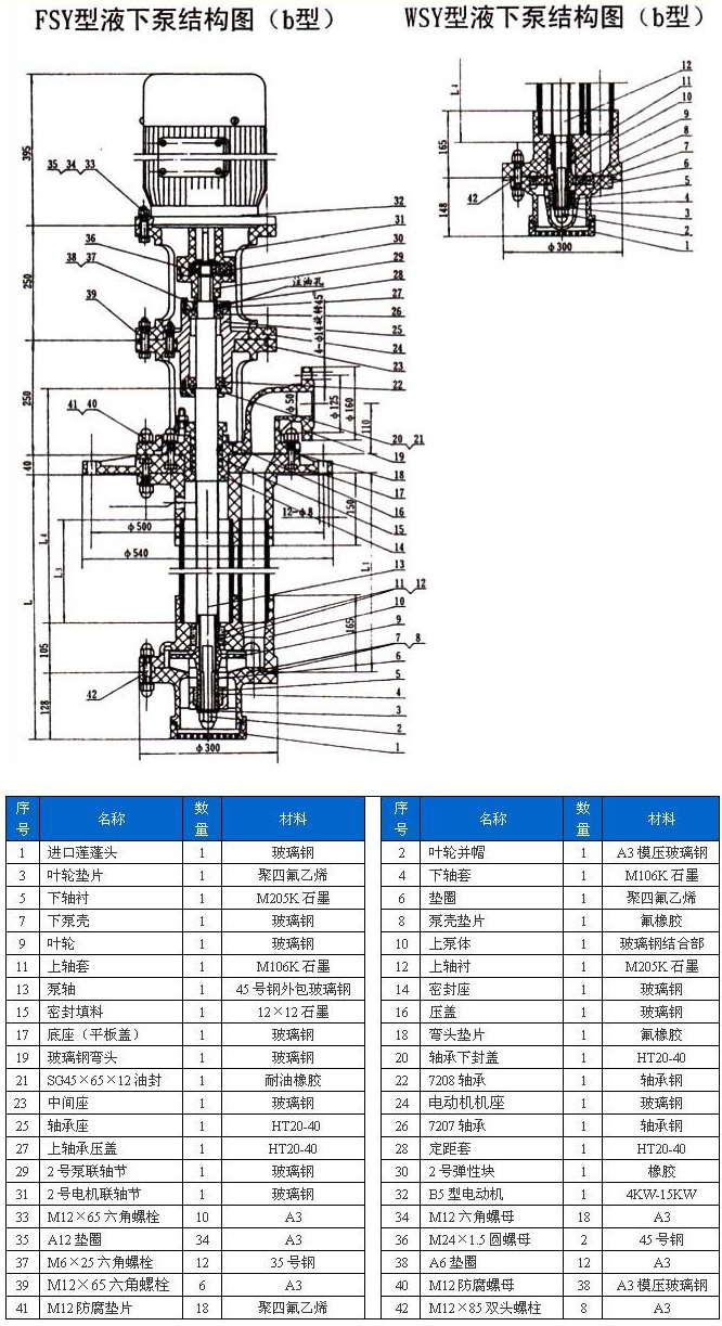 公司生產(chǎn)的FSY型立式玻璃鋼液下泵,該泵因伸入貯罐,貯槽的深度長短不同,設(shè)計(jì)液下深度有800mm-3000mm之間任意選擇。只要液體高于泵體,即可不灌液而起動(dòng)送液,平蓋板下設(shè)有泄漏孔,液體不會(huì)向貯灌外泄漏。 本泵與介質(zhì)接觸的零部件,系用聚已烯醇縮丁醛改性酚醛玻璃纖維,經(jīng)高溫模壓成型的酚醛玻璃鋼制件,連接管、出液管采用半干法卷制工藝制成的酚醛玻璃鋼管,葉輪軸套的裝配均用酚醛膠泥和泵軸粘成一體,液下各部裝配均用酚醛膠泥粘結(jié),伸入液下全無金屬與介質(zhì)接觸,耐腐性能絕對(duì)可靠,產(chǎn)品具有輕質(zhì)、高強(qiáng)、不變形、耐溫、耐腐蝕等優(yōu)良性能,在防腐方面可部分替代含鉬不銹鋼、鈦及鈦合金等貴重金屬。