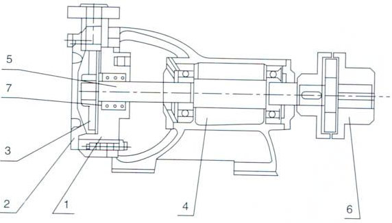 主要零件(見(jiàn)結(jié)構(gòu)圖)有(1)泵(2)泵蓋(3)葉輪(4)托架結(jié)合體(5)泵軸(6)爪型彈性聯(lián)軸器(7)特別組合體機(jī)械密封。該型泵與電機(jī)合裝在同一底座上.進(jìn)、出口方向?yàn)樾辫上.經(jīng)接彎管可変為垂直向上。葉輪在軸上能夠自由地作軸向移動(dòng),泵在工作中葉輪能自行調(diào)節(jié)好與泵體和泵蓋之間的間隙。