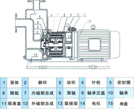 ZCQ型自吸式磁力驅(qū)動(dòng)泵(以下簡(jiǎn)稱自吸泵),該泵以靜密封取代動(dòng)密封,使泵的過(guò)流部件處于完全密封狀態(tài),徹底解決了其它泵機(jī)械密封無(wú)法避免的跑、冒、滴、漏之弊病,泵體及過(guò)流部件的材料均采用了耐腐蝕的不銹鋼、鋼玉陶瓷、四氟石墨等材料制造,既有CQ型磁力驅(qū)動(dòng)泵的功能,又集自吸于一身,不需底閥和引灌水,自吸高度4米。